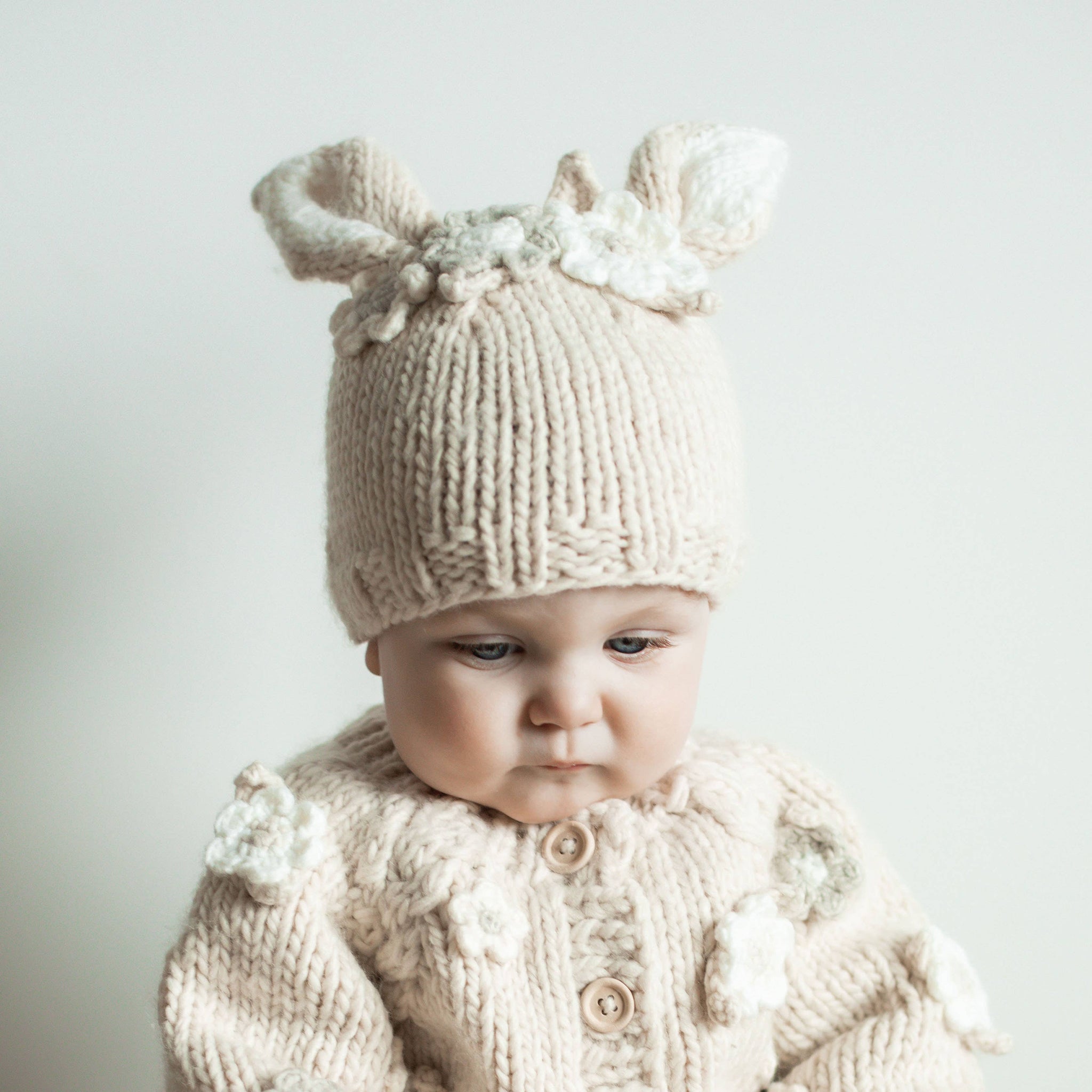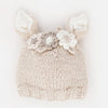 Soft hand knit beanie hat in Natural has stand-up bunny ears lined in creamy white yarn and trimmed in a pretty garland of flowers in shades of White, Natural and tTan. Perfect for Easter and Halloween wear, or anytime you want to look adorbs like a cute little cottontail!!