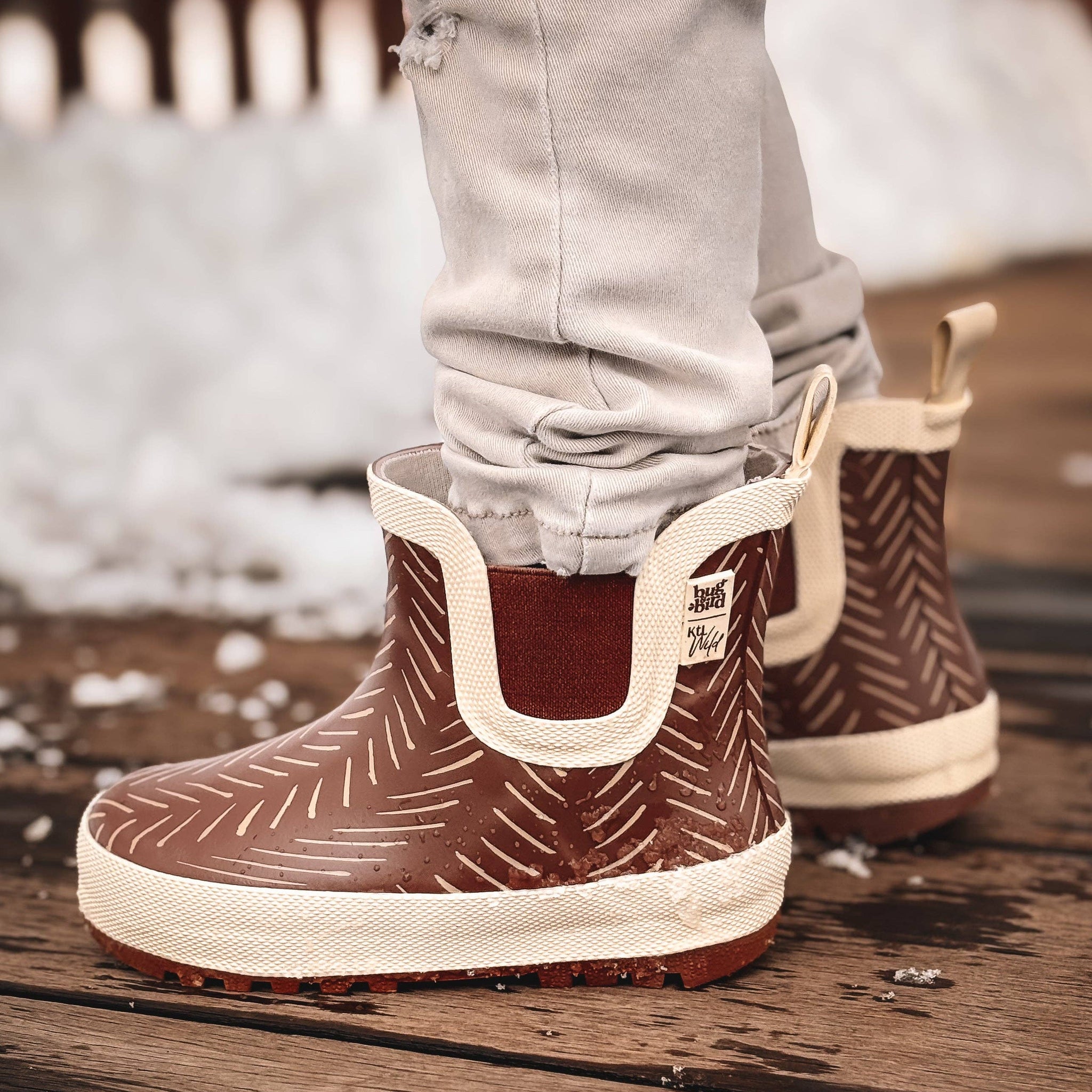 The Summit Rain Boots are designed for easy slip on, perfect for busy parents and their little ones. The neutral Summit pattern, in collaboration with Bug & Bird brand, adds a fun touch. Plus, an addition of a sole detail makes it easy for kids to put their shoes on the right feet. A must-have for any family!